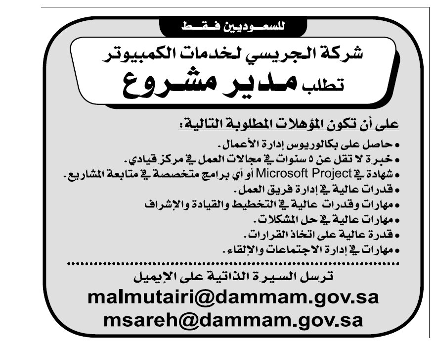 شركة الجريسي لخدمات الكمبيوتر وظيفة مدير مشروع بكالويوس إدارة اعمال